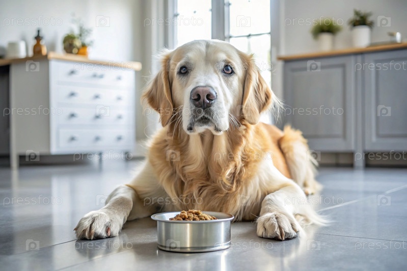 Милая собака золотого ретривера рядом с миской на белой кухне.Собака смотрит в камеру.Уход за животными