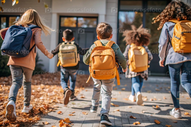 Праздник приходится на 1 сентября. Дети с желтыми рюкзаками бегут в школу. Обратный взгляд. Давайте вернемся в школу. Концепция нового учебного года в школе. Осенний день знаний