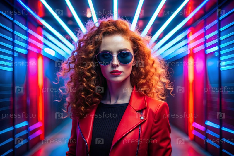 Молодая стильная красивая девушка в солнцезащитных очках стоит в неонном туннеле среди неоновых вывесок