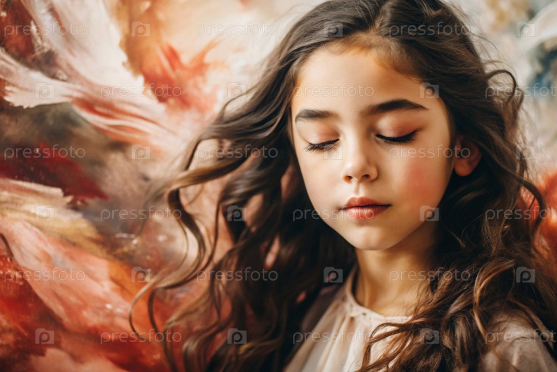 Портрет красивой маленькой брюнетки с длинными волнистыми волосами и вдумчивым взглядом.Волосы развиваются и создают ощущение легкости и естественности