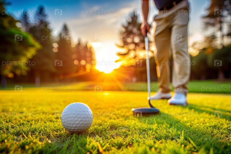 Баннер. белый мяч и металлическая клюшка для гольфа лежат на газоне в руках мужчины среди заката солнца. реклама матча по гольфу в кантри-клубе. свободное место для текста