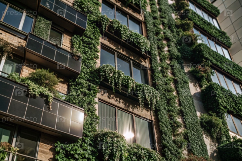Новый жилой район с современными семейными новостройками, многоэтажное здание со солнечными батареями для электроснабжения и отопления фасадов