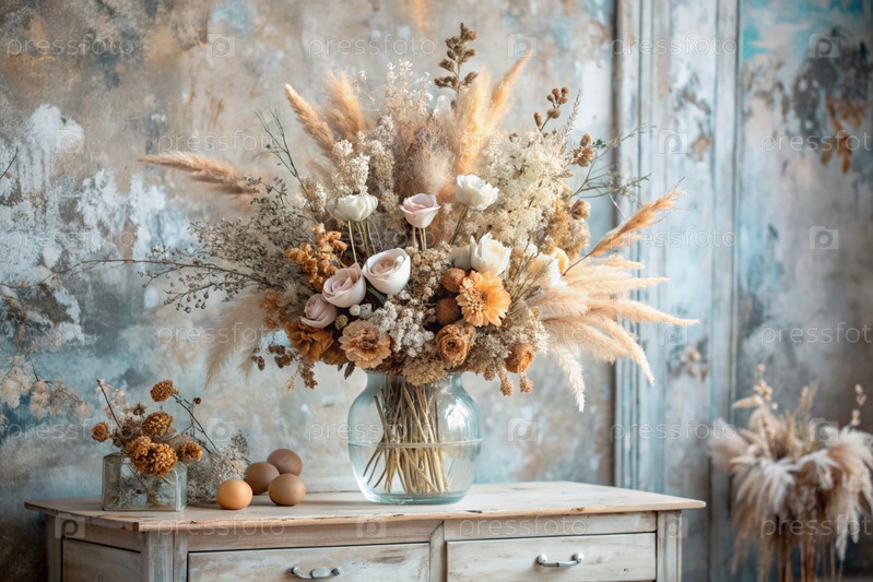 Красивый букет сушеных цветов в стеклянной вазе и флаконы на древнем деревянном шкафчике. Букет цветов в вазе во внутренней части дома. Светлый, бежевый, синий цветочный фон