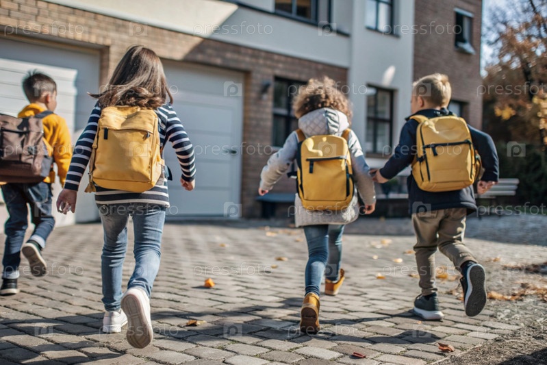 Праздник приходится на 1 сентября. Дети с желтыми рюкзаками бегут в школу. Обратный взгляд. Давайте вернемся в школу. Концепция нового учебного года в школе. Осенний день знаний