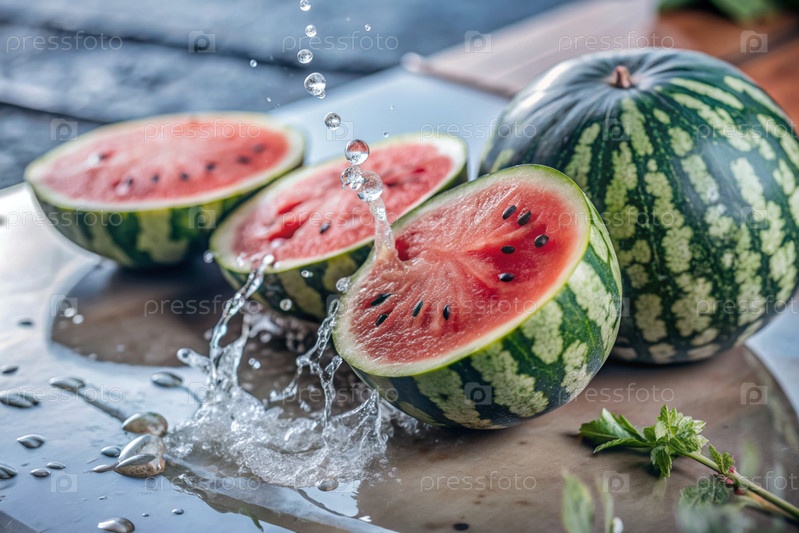 Закрытие свежих ягод арбуза. Вкусные ягоды и фрукты ярко-красного цвета с капельками воды. Вегетарианство. Здоровое питание. Свежие плоды на столе