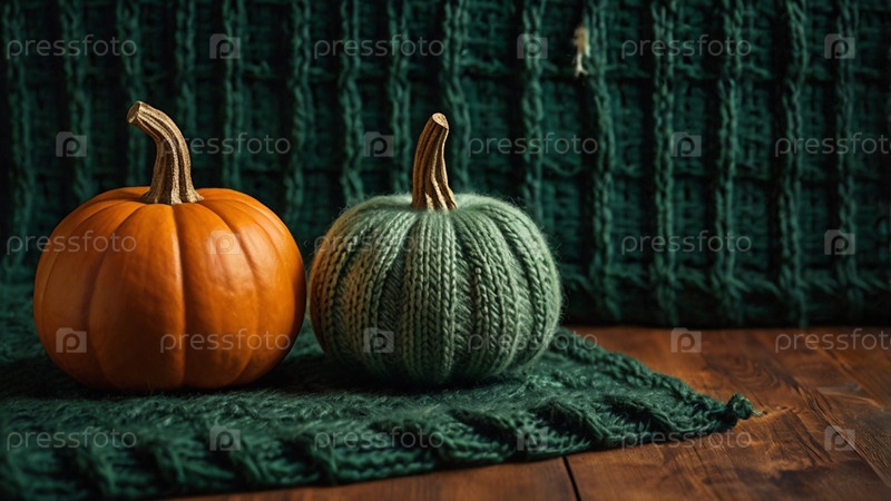 Красивый осенний фон. Хэллоуин, День благодарения. Зеленый вязаный тыквенник на фоне зеленых трикотажных волокон
