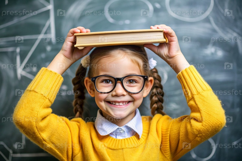 Красивая девушка с очками и книгами на голове. Ребенок впервые идет в школу. Ребёнок в классе со доской на заднем плане. Возвращение к школе
