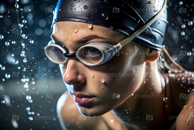Спортивное плавание. Женское плавание. Спортсменка, которая носит очки для плавания в бассейне во время соревнований на близком расстоянии. Женщина смотрит прямо в камеру