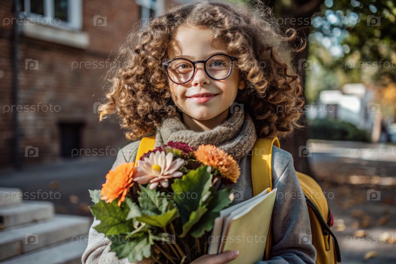 Красивая маленькая кудрявая девочка в очках и букете осенних цветов ходит в школу впервые. Ребенок со школьной сумкой, книгой и цветами. Малыш на городской улице. Возвращение к школе