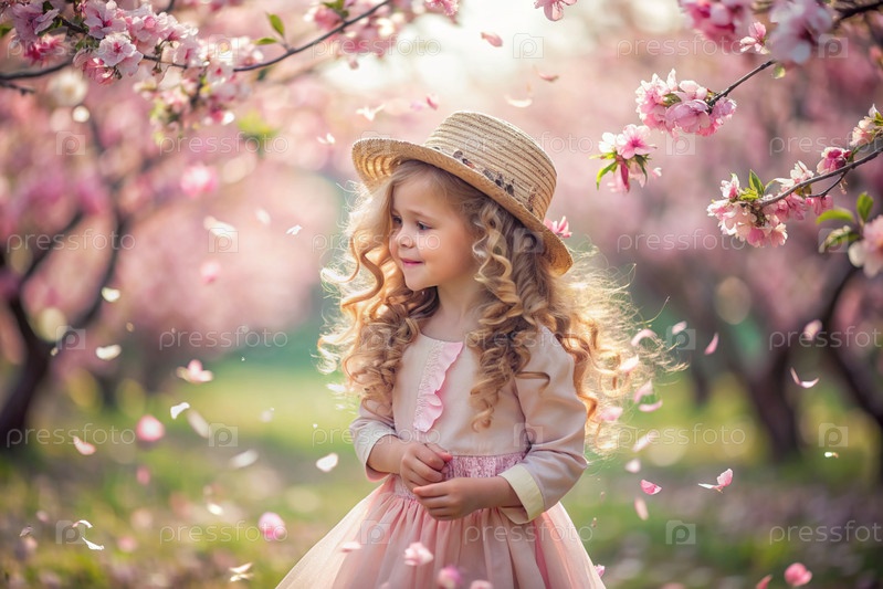 Портрет красивой маленькой кудрявой 4-летней девочки в соломенной шляпе и платье в цветущем розовом саду яблок. Детство. Ребенок позирует и смотрит на камеру