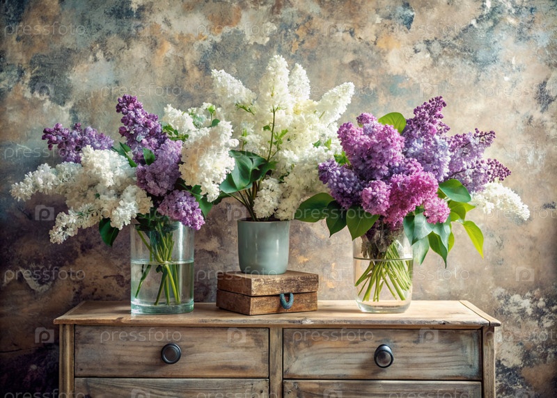 Красивые белые и фиолетовые лиловые цветы в стеклянных вазах и бутылках на деревянном шкафу. Букет цветов в вазе. Светлый, белый, розовый и синий цветочный фон