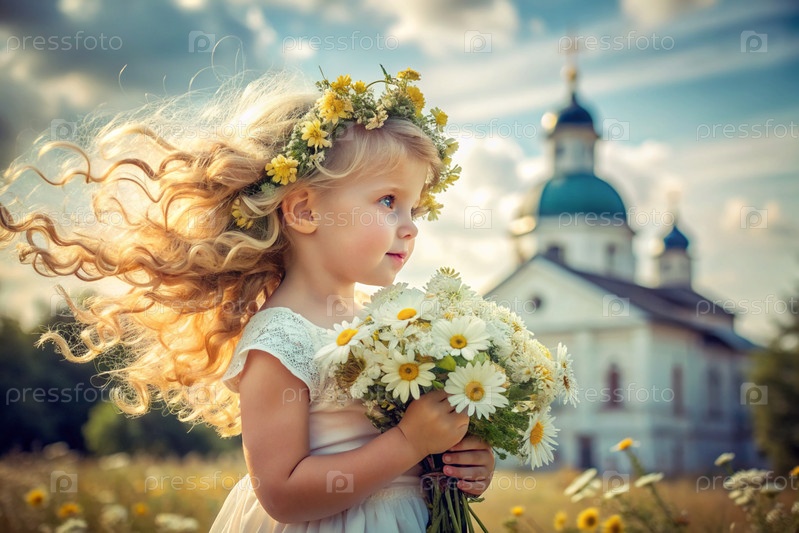 Всероссийский День семьи, любви и верности Красивая маленькая кудрявая девочка с букетом ромашек на фоне Православной церкви День святого Валентина Петра и Февронии