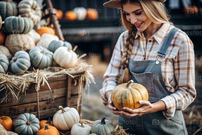Руки женщины в квадратной рубашке с тыквенным крупным планом и красивым осенним рисунком. Сбор тыков. Концепция празднования Дня благодарения и Хэллоуина