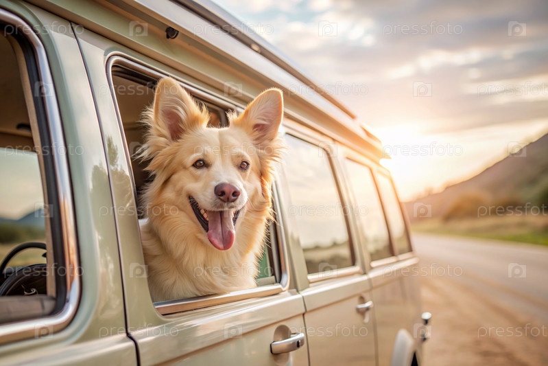 Собака выбивает голову из окна автомобиля, туристического фургона во время поездки в жаркий солнечный день