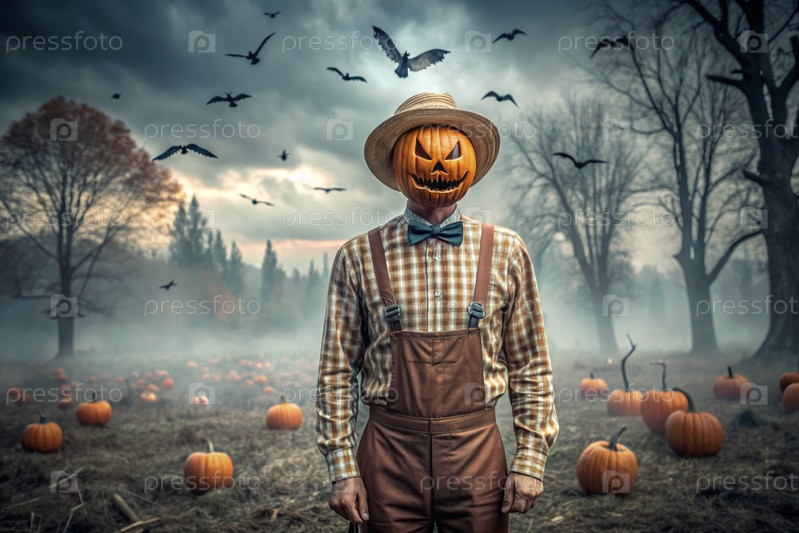 Концепция Хэллоуина. Ужасная. Страх. Устрашающий богий с тыквенной головой, квадратной рубашкой и бабочкой. Баннер, открытка