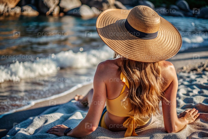 Женщина на отдыхе, сидящая в купальнике и соломенной шляпе с широкими краями на пляже в солнечный день и смотрящая на море