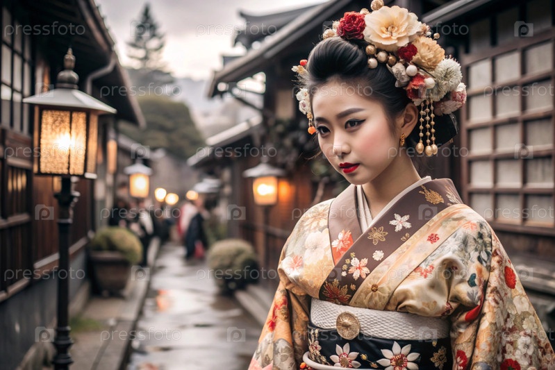 Японская девушка в традиционном национальном костюме - кимоно. На фоне домов, фонарей и вишневых деревьев портрет символизирует традиции и культуру народа Японии