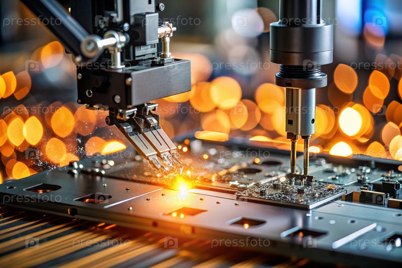 Автоматизированное производство электронных устройств. Современные роботизированные манипуляторы на сборочной линии чипов и печатных платок на современном электротехническом заводе. Установка компонентов на доске