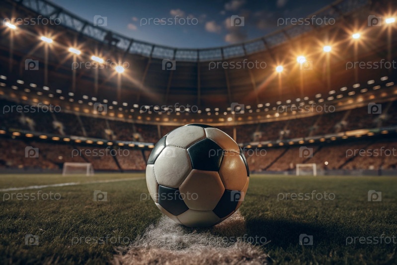 Футбольный мяч на зеленом поле футбольного стадиона, готовый играть в центре поля