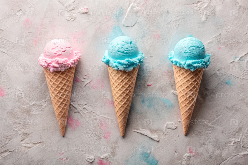 Баннер.Сладкий десерт.Конусы мороженого с разными вкусами.Голубое, розовое мороженое на фоне двух пастельных цветов: синего и розового