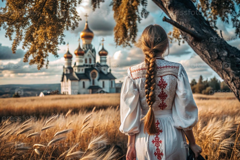 Девушка в традиционном русском льняном наряде и с сковородой на голове на поле спелой золотистой пшеницы на фоне березы и православной церкви