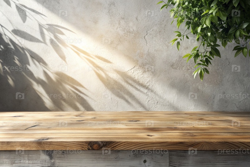 Пустая старая деревянная столешница на серой стене с солнечным светом и тенями от листьев деревьев