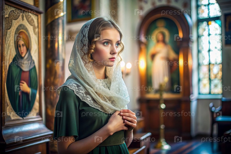 Портрет красивой молодой женщины с платками в православной церкви.Девушка молится в церкви среди икон