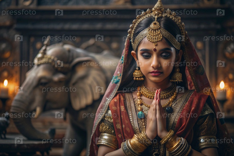 Красивая индийская девушка в традиционном национальном костюме, сари. со слонами. портрет символизирует традиции, культуру и красоту народа Индии
