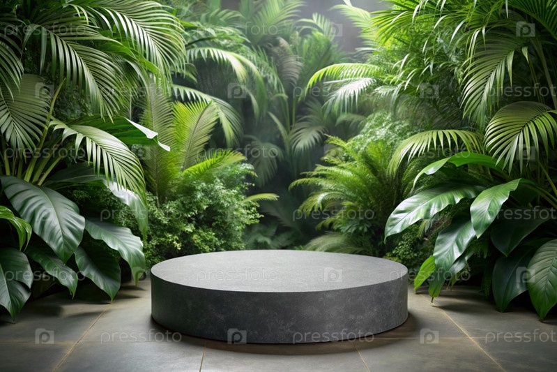 Круглая подиумная площадка для рекламы продуктов из серого камня на фоне тропических листьев в джунглях Пустой стенд, сделанный из натурального камня для демонстрации косметической продукции