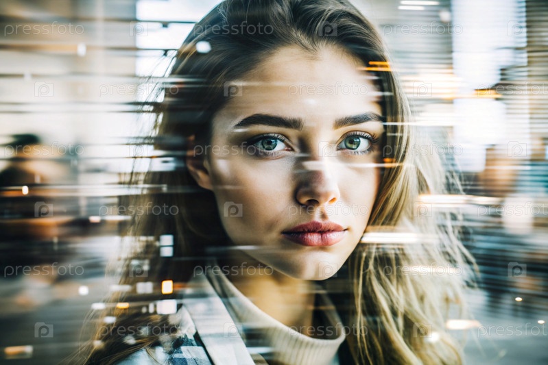 Портрет молодой женщины.Концептуальное искусство Клубовое изображение на фоне города с двойной экспозицией и визуальными эффектами