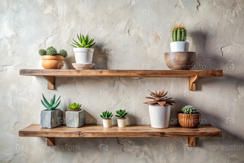 Детали дизайна интерьера. На яркой стене расположены деревянные полки с горшковыми растениями. Скандинавский стиль