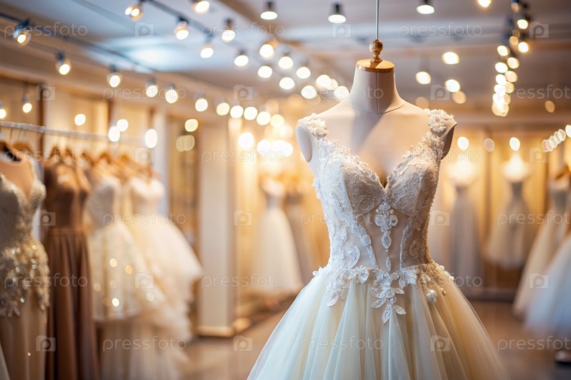 Аренда и покупка свадебных платьев для мероприятий. Близкие. Элегантное белое свадебное платье на манеке в роскошном брачном салоне