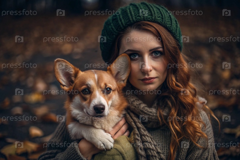 Женщина обнимает валлийскую собаку Корги в осеннем парке.Сознательная жизнь с домашним животным, концепция дружбы и любви к животным