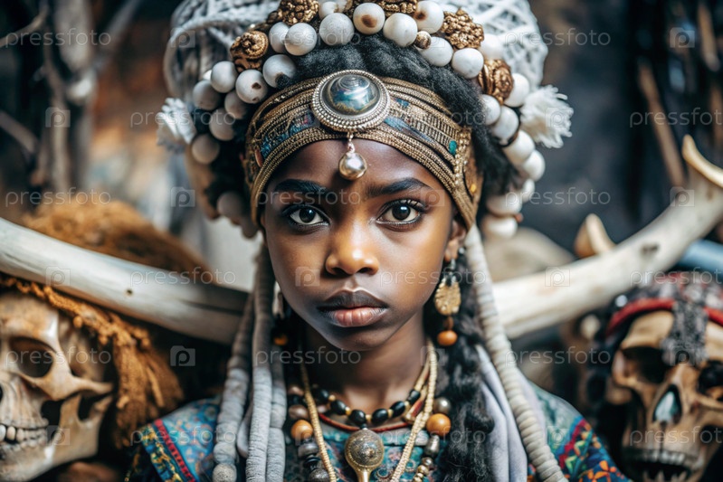 Красивая африканская девушка в традиционном национальном костюме. с костями. портрет символизирует традиции, культуру и красоту африканского народа