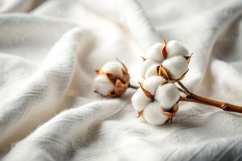 Текстильная промышленность. Хлопок. Хлопковый цветок на фоне белого хлопкового ткани. Место для текста