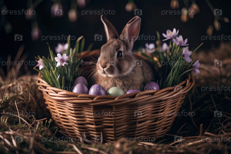 Баннер. пасхальный кролик в корзине из красочных пасхальных яиц вокруг весенних снегопадов и первичной розы. концепция праздника Пасхи