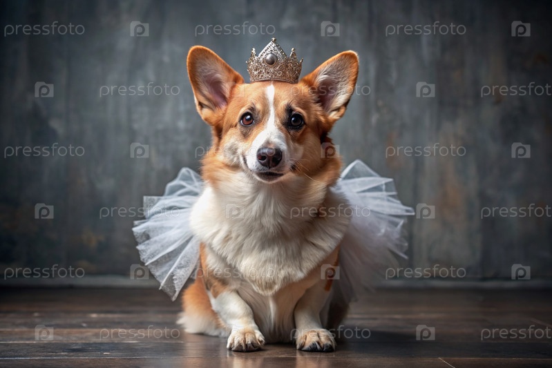 Красивый портрет симпатичной красной валлийской собаки Корги, одетой в розовое туту и с короной на голове