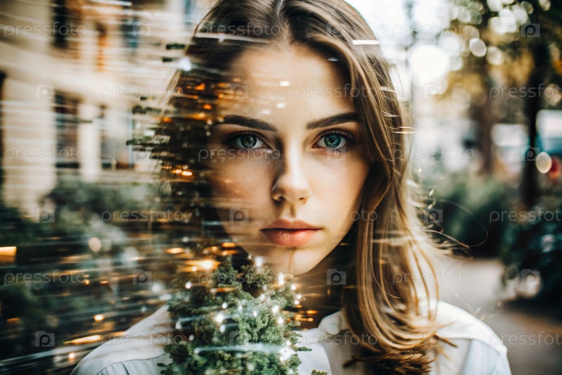 Портрет молодой женщины.Концептуальное искусство Клубовое изображение на фоне города с двойной экспозицией и визуальными эффектами