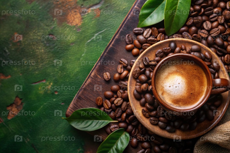 Чашка освежающего черного кофе и кофейных зерен на старом зеленом столе