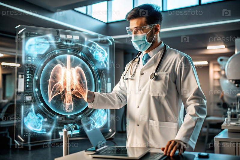 Врач в белом пальто демонстрирует голографическую модель человеческого легкого.Развитие медицинских технологий с использованием искусственного интеллекта