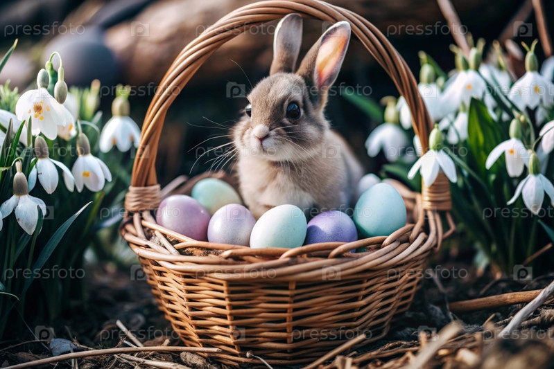 Баннер. пасхальный кролик в корзине из красочных пасхальных яиц вокруг весенних снегопадов и первичной розы. концепция праздника Пасхи