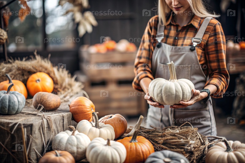 Руки женщины в квадратной рубашке с тыквенным крупным планом и красивым осенним рисунком. Сбор тыков. Концепция празднования Дня благодарения и Хэллоуина