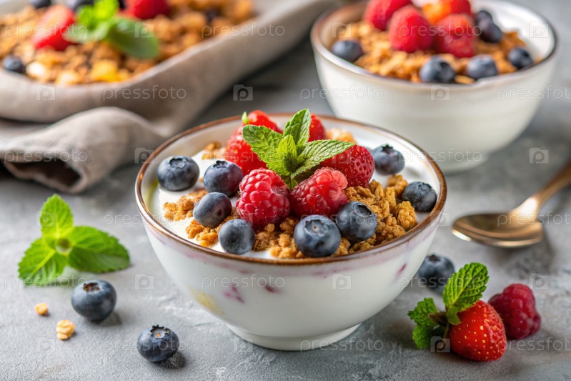 миска домашнего йогурта, мусли, ягод и орехов. здоровый и вкусный завтрак. доброе утро