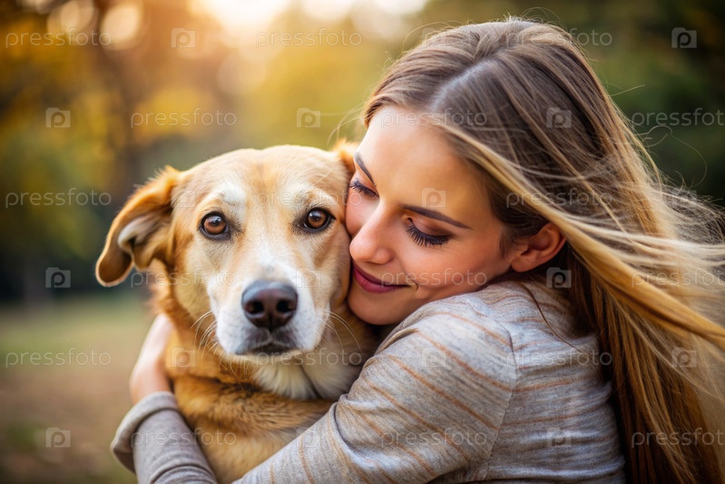 Животные.Молодая женщина обнимает собаку.Сознательная жизнь с питомцем, понятие дружбы и любви к животным