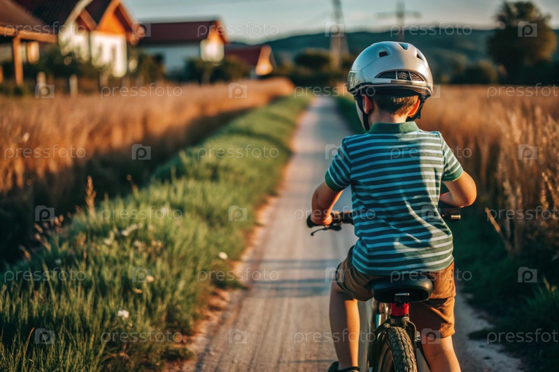 Веселый маленький мальчик катается на велосипеде в шлеме на открытом воздухе. Счастливый ребенок занимается активными видами спорта. Защита. Страхование жизни и безопасность детей