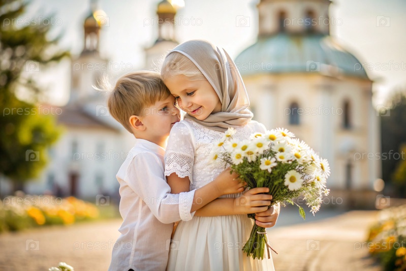 Всероссийский день семьи, любви, верности. милый мальчик и девочка с букетом ромашек на фоне православной церкви. День святого Валентина Петра и Февронии. религия, христианство