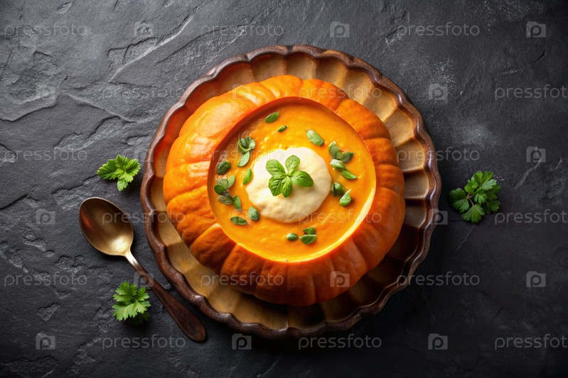 Традиционный мягкий тыквенный кремовый суп с сливками и семьями тыквы на черном бетонном фоне