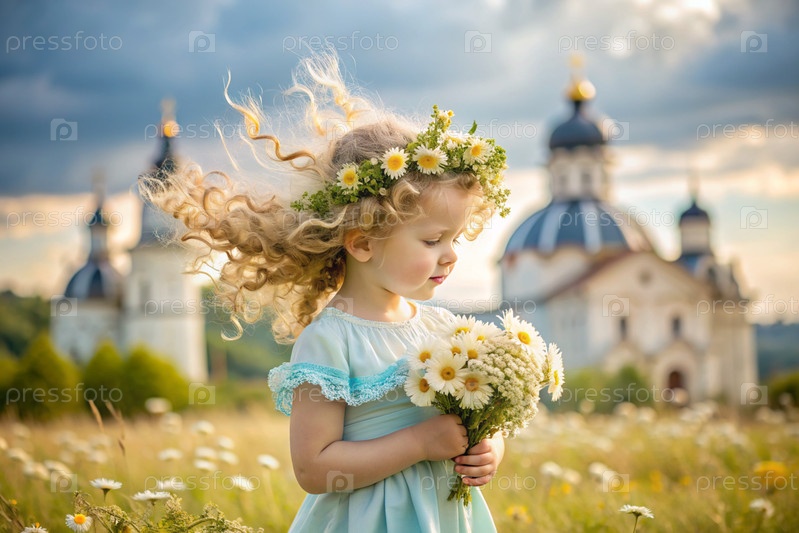 Всероссийский День семьи, любви и верности Красивая маленькая кудрявая девочка с букетом ромашек на фоне Православной церкви День святого Валентина Петра и Февронии