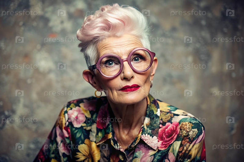 Портрет стильной, модной пожилой женщины, пенсионерки 70 лет, которая носит очки и одежду с цветочными оттисками