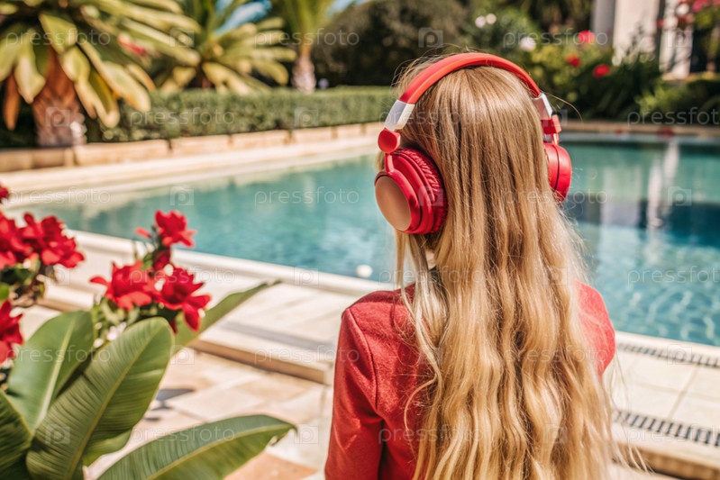 Молодая девушка слушает музыку с помощью больших наушников, стоит у бассейна спиной к камере